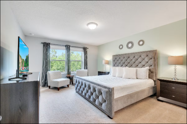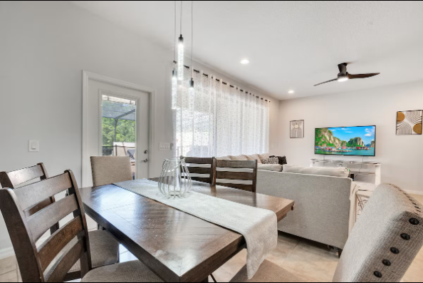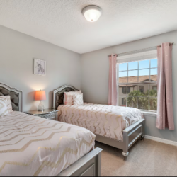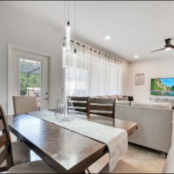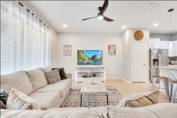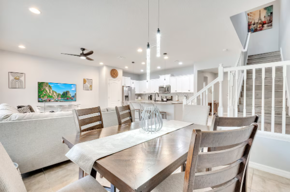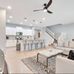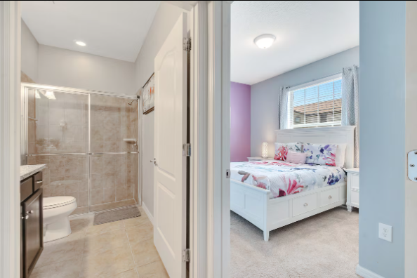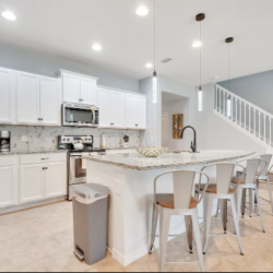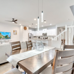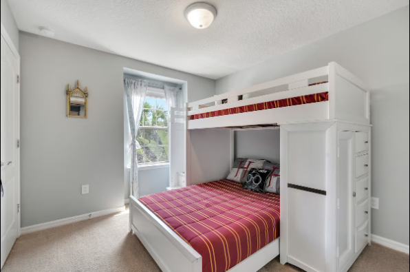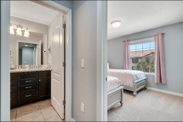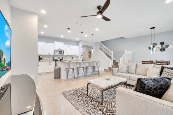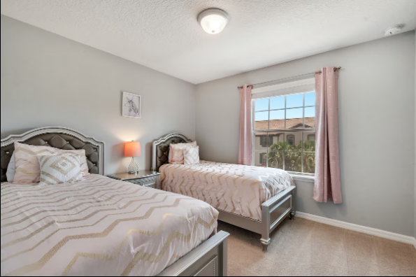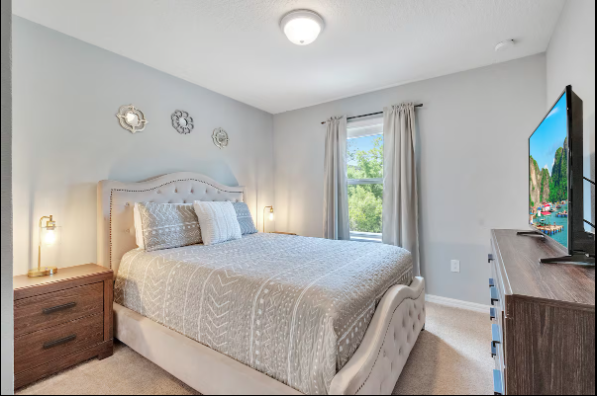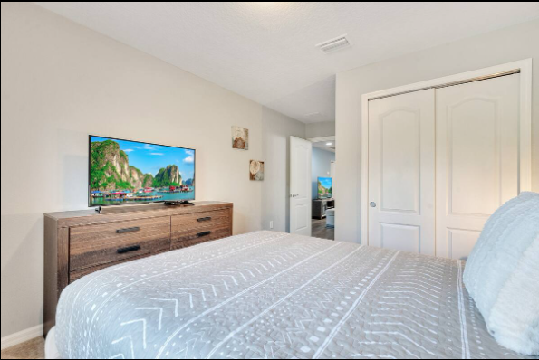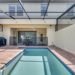 EnJoY! This 5 bedrooms (2 Suites) 4 1/2 bathrooms townhouse with private pool located in Windsor at Westside Resort, a gated and safe community. Just 20 min away from Disney Theme Parks and close to all other Orlando attractions, restaurants, and supermarkets. The community offers amenities such as full service bar, slides, lazy river, jacuzzi, pool, gym, tennis court, etc.