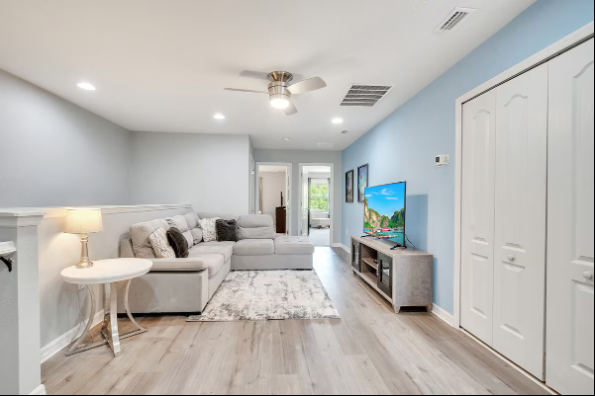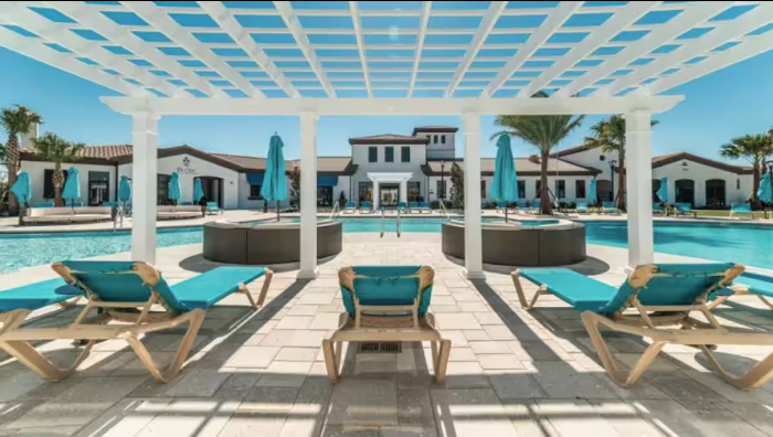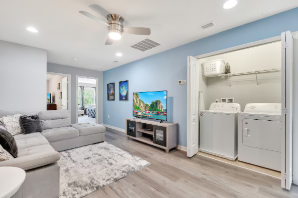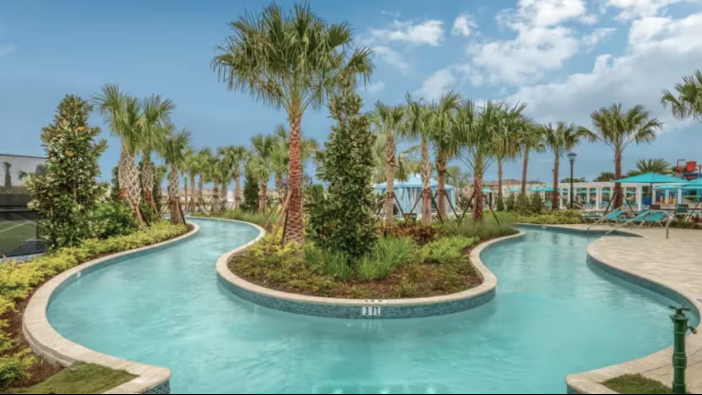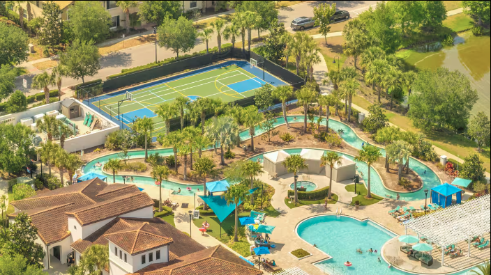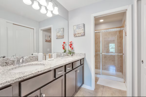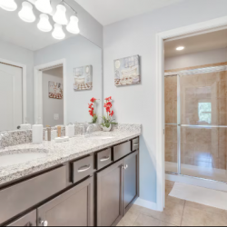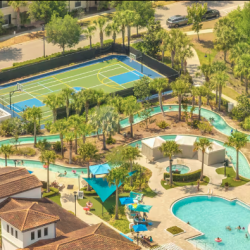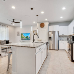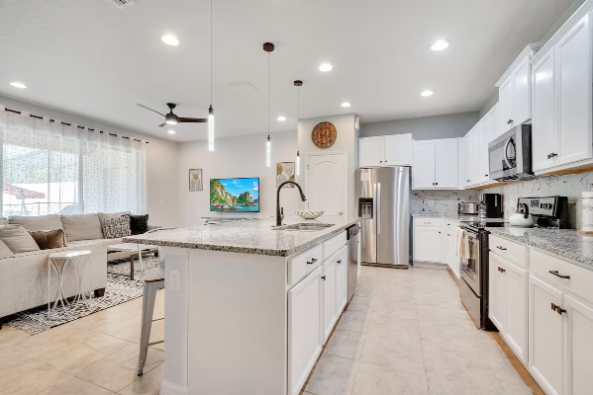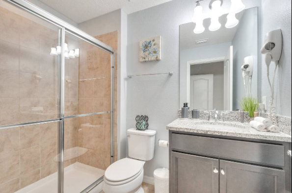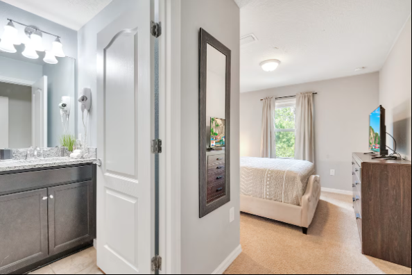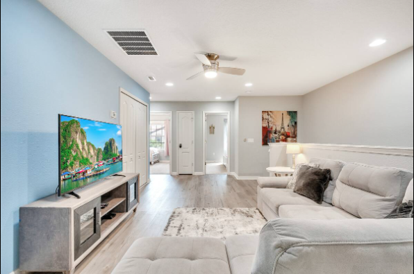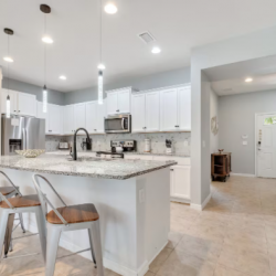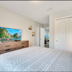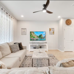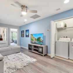 EnJoY! This 5 bedrooms (2 Suites) 4 1/2 bathrooms townhouse with private pool located in Windsor at Westside Resort, a gated and safe community. Just 20 min away from Disney Theme Parks and close to all other Orlando attractions, restaurants, and supermarkets. The community offers amenities such as full service bar, slides, lazy river, jacuzzi, pool, gym, tennis court, etc.
